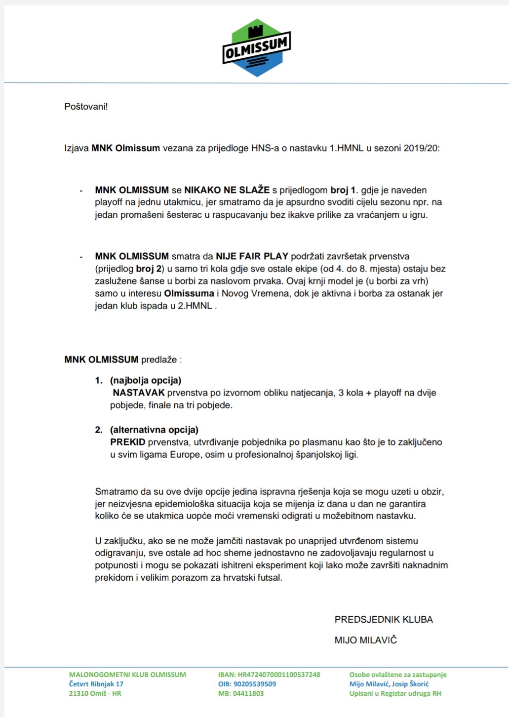 Nakon objave HNS-ovih prijedloga o nastavku natjecanja, reagirali su iz omiškog Olmissuma, trenutno vodeće momčadi 1.HMNL. Omišani nisu zadovoljni ponuđenim prijedlozima, te smatraju da ukoliko se natjecanje ne može privesti kraju u izvornom obliku, treba proglasiti kraj natjecanja uz trenutni poredak na ljestvici. Priopćenje Olmissuma koje potpisuje predsjednik kluba Mijo Milavić donosimo u cijelosti.